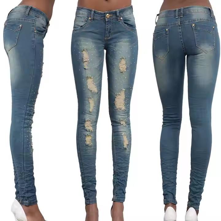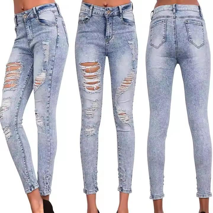 กางเกงยีนส์ขาตรงสลิมฟิตสำหรับผู้หญิงผ้าสแปนเด็กซ์สต็อกแบบจีนมีรอยขาดเข้ารูป