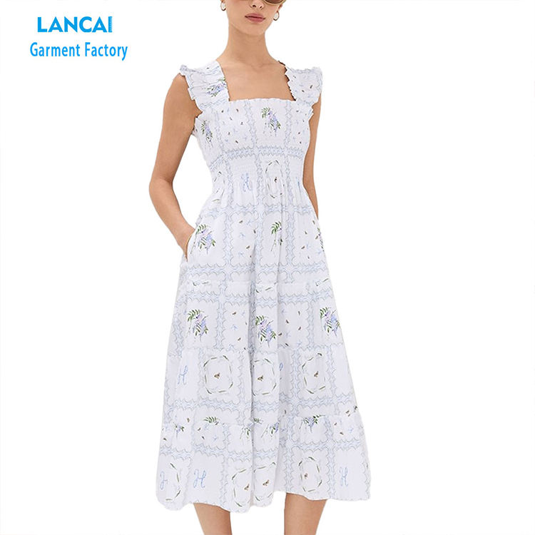เดรสชายหาดพิมพ์ลายเซ็กซี่สำหรับผู้หญิงเดรสแมกซี่โบฮีเมียนคอเหลี่ยมปักตามสั่ง