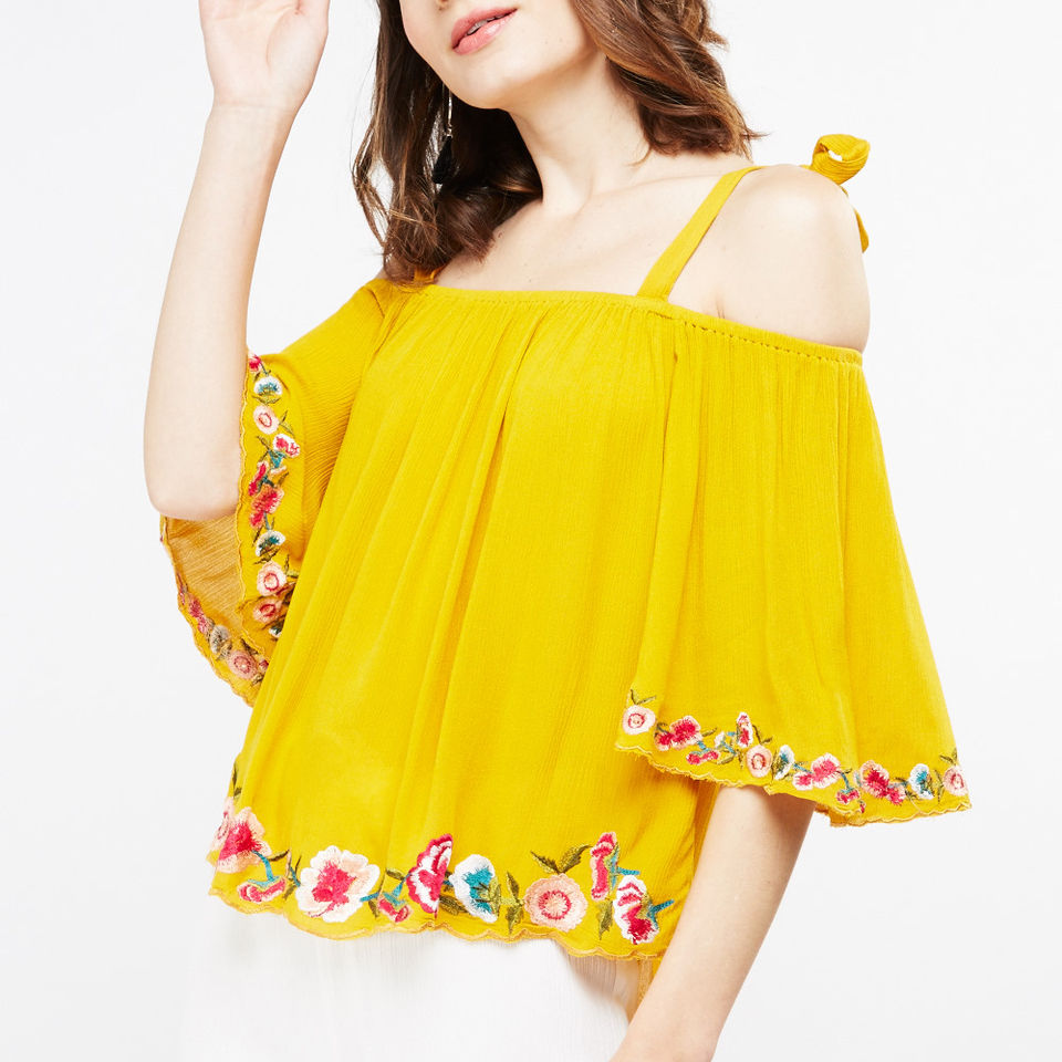 เสื้อยืดสำหรับผู้หญิงแบบสะพายไหล่สีเหลืองสำหรับผู้หญิงเสื้อยืดพิมพ์ลายแบบกำหนดเองได้