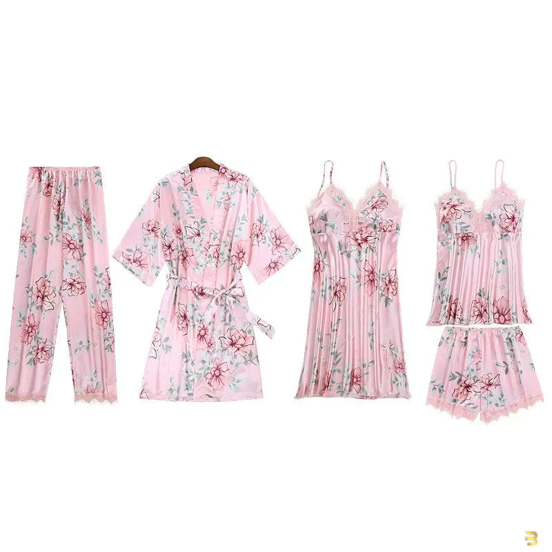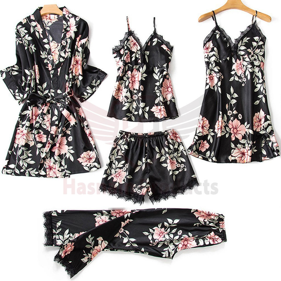 สุภาพสตรีสปาเก็ตตี้ชุดราตรีสวมใส่ชุดนอนสวมใส่ 5 ชิ้นพิมพ์ผ้าไหมสาวชุดนอนชุดสตรีชุดนอน