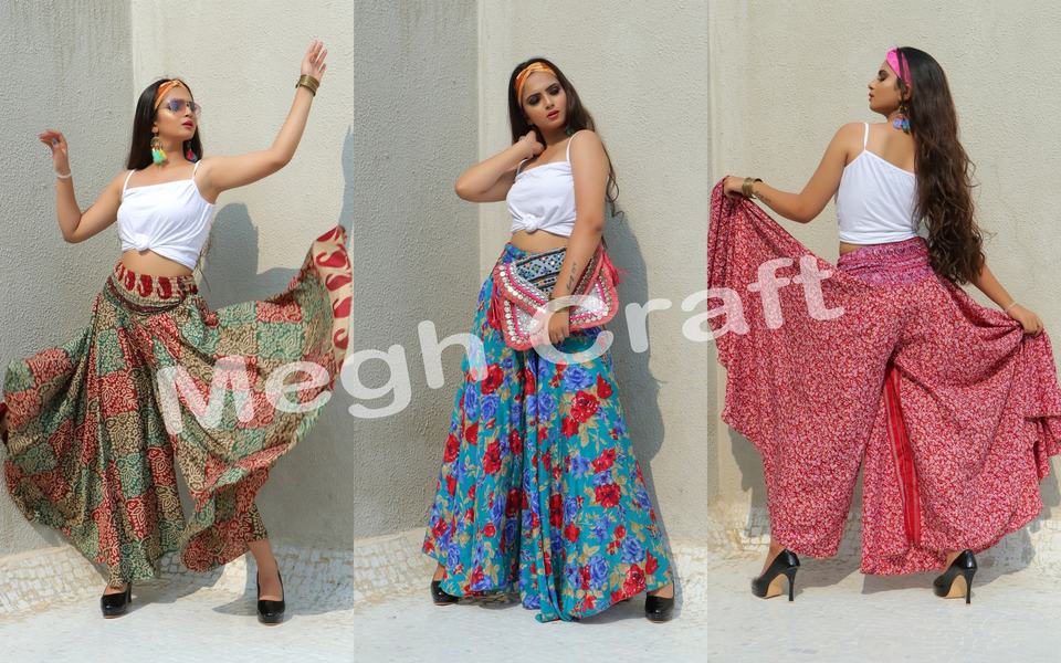 Ladies Vintage Silk Saree Pants Boho Palazzo Trouser with Umbrella Detail Plus Size Wholesale Silk Palazzo Pants
