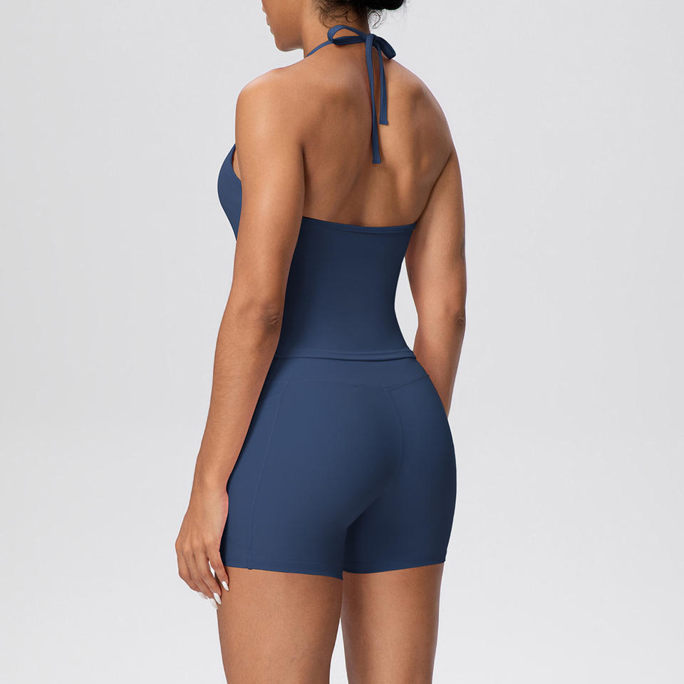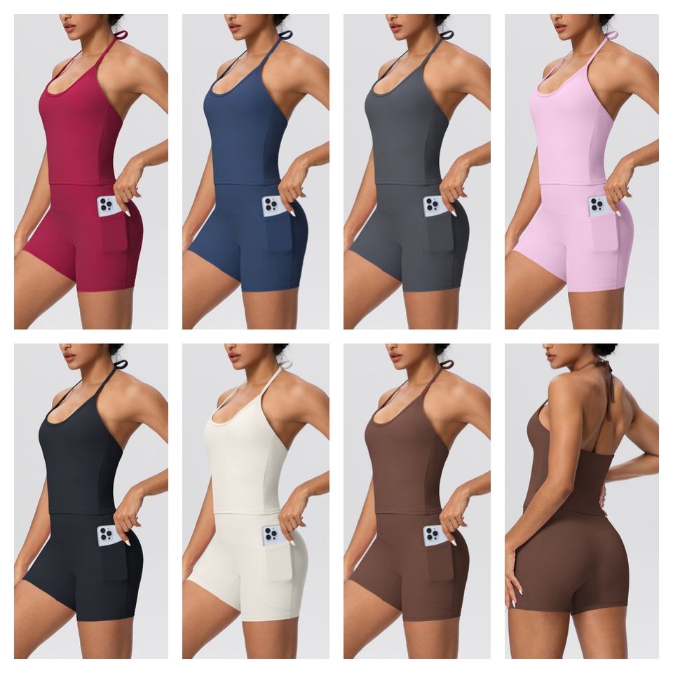 ชุดโยคะเต้นรำสำหรับผู้หญิง เสื้อกล้ามแบบผูกคอ กางเกงขาสั้นเอวยางยืดสูง มีกระเป๋า ชุด 2 ชิ้น ชุดออกกำลังกาย ชุดโยคะไซส์ใหญ่สำหรับผู้หญิง