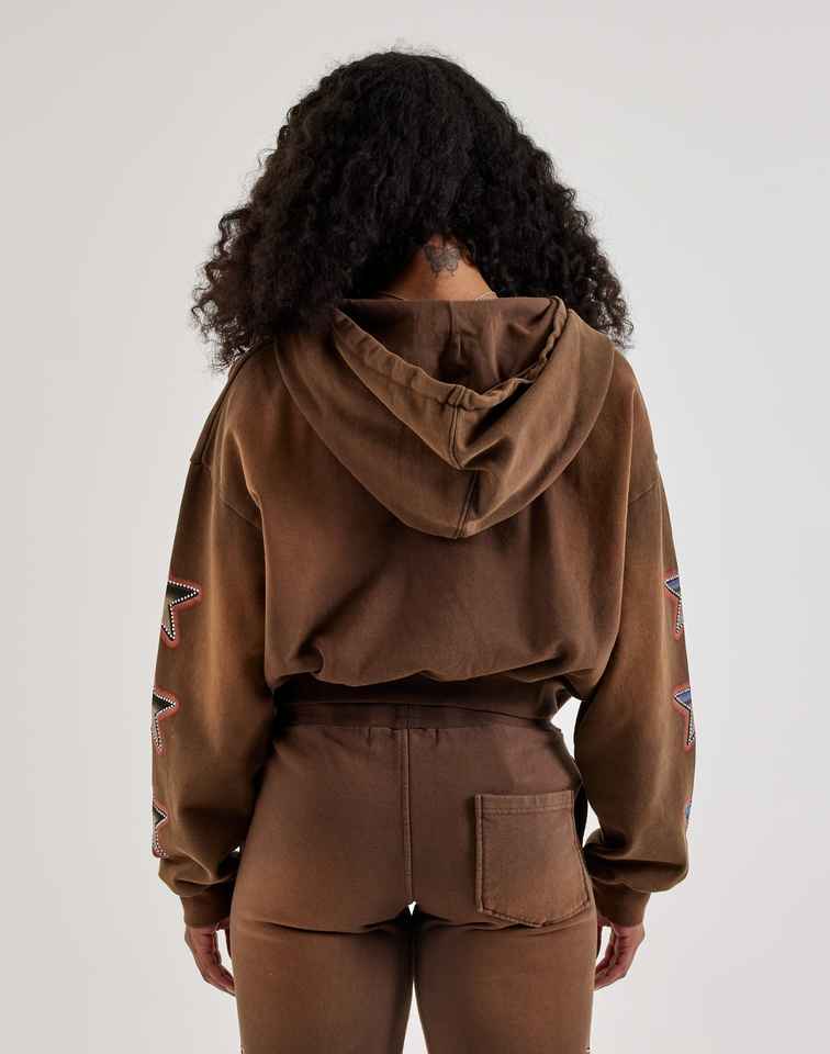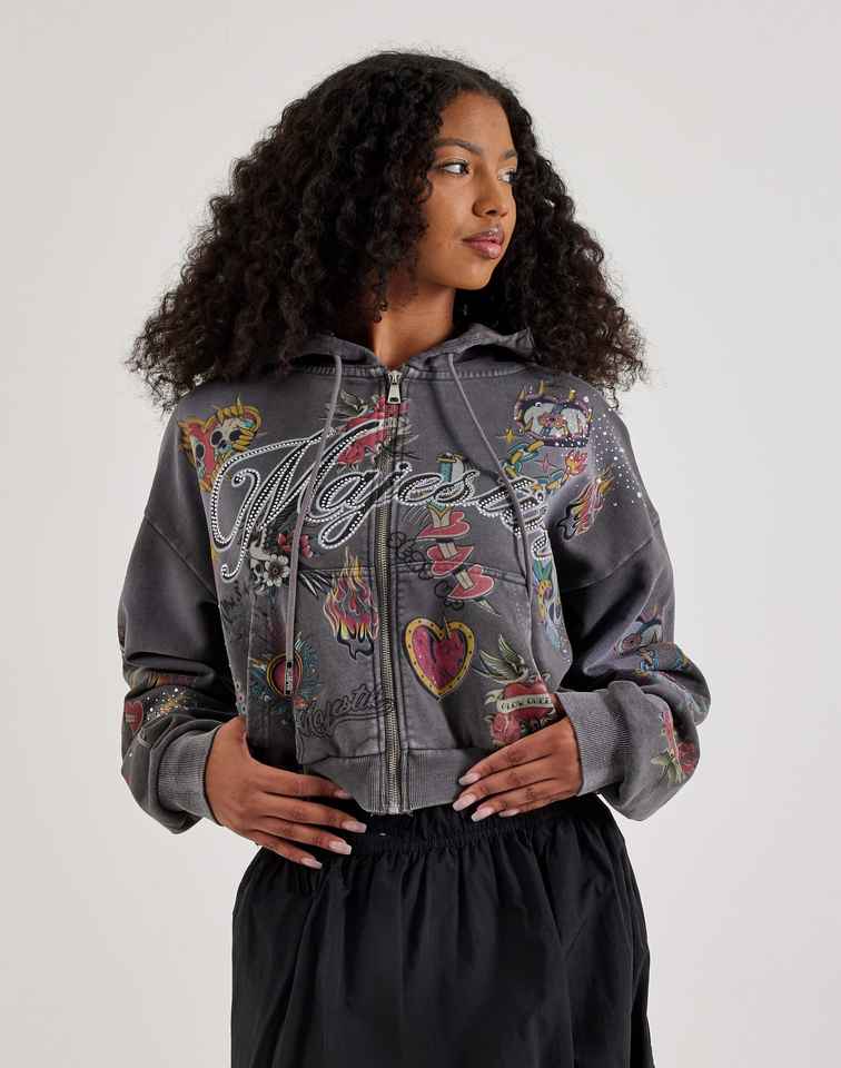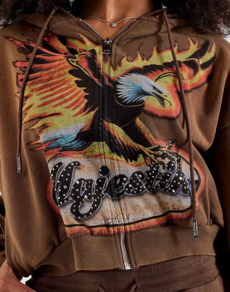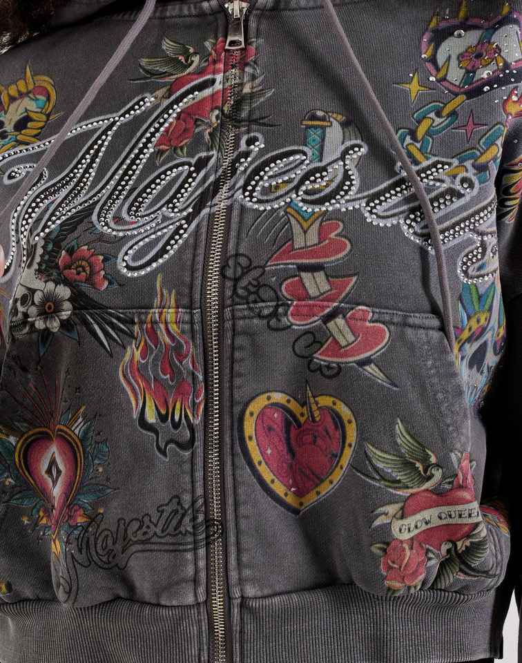 เสื้อฮู้ดดี้ผู้หญิงแบบซิป สไตล์วินเทจ ผ้าฝ้ายเฟรนช์เทอร์รี่ 100% ล้างสีแบบแอซิดวอช ประดับคริสตัล พิมพ์ลายตามสั่ง กระเป๋าขนาดใหญ่พิเศษ ไซส์ XL