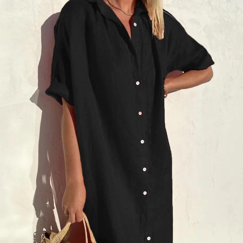 เดรสกระโปรงยาวมีกระเป๋าสำหรับผู้หญิง, เดรสกระโปรงมีกระดุมแขนสั้นทรงหลวมลำลองหรูหรา
