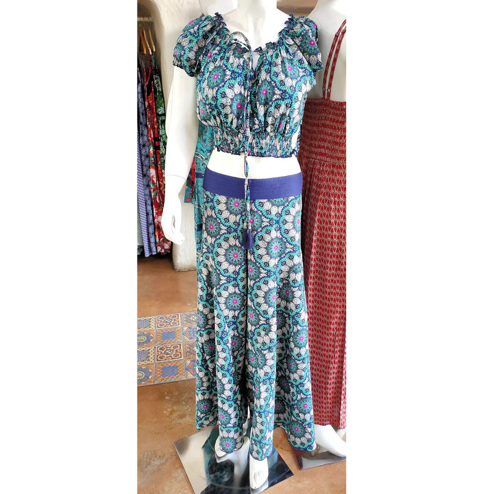 ชุดเสื้อผ้าสไตล์ยิปซีโบฮีเมียนสำหรับผู้หญิงใส่ฤดูร้อนกางเกงผ้าคอตตอนเนื้อนุ่มพิมพ์ลายกางเกงบานด้านหน้าแบนผ้ายืดเอวสูงปานกลาง