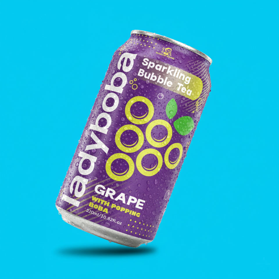 เลดี้ โบบา เบิร์สติ้ง สปาร์คกลิ้ง ป๊อปปิ้ง โบบา ที รสพีชองุ่น สองรสชาติ พร้อมเนื้อผลไม้ในน้ำ กระป๋อง 310 มล.