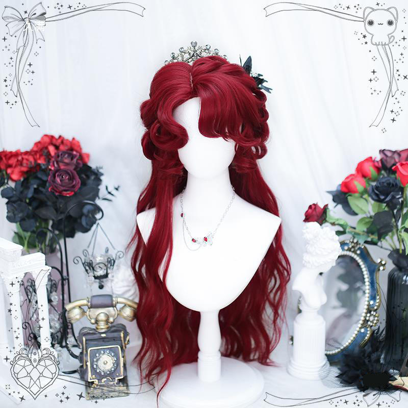 เลดี้โรสวิกผมหยิกยาวอะนิเมะคอสเพลย์หมวกคลุมศีรษะเต็มรูปแบบเส้นใยคานกะลอนเส้นผมธรรมชาติโปร่งใสลูกไม้สีแดง