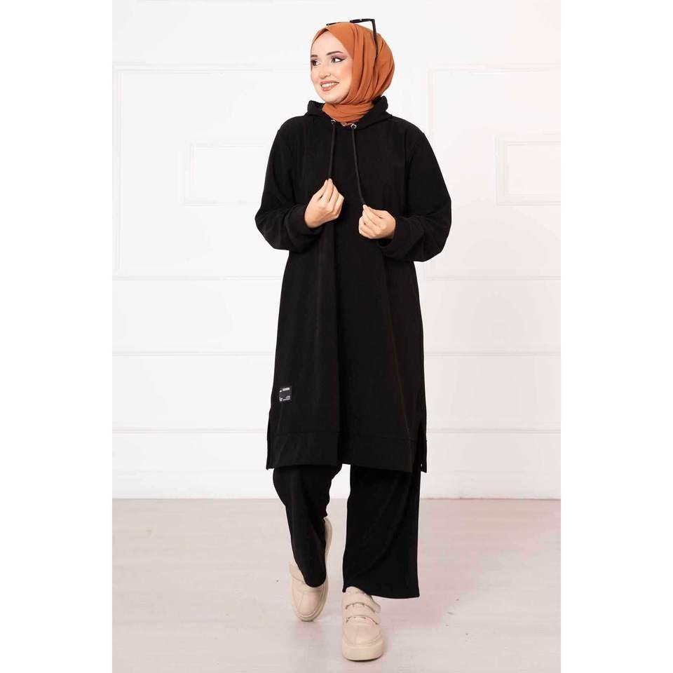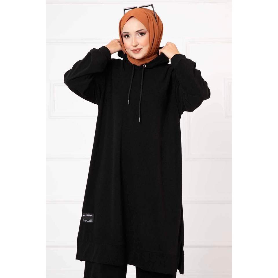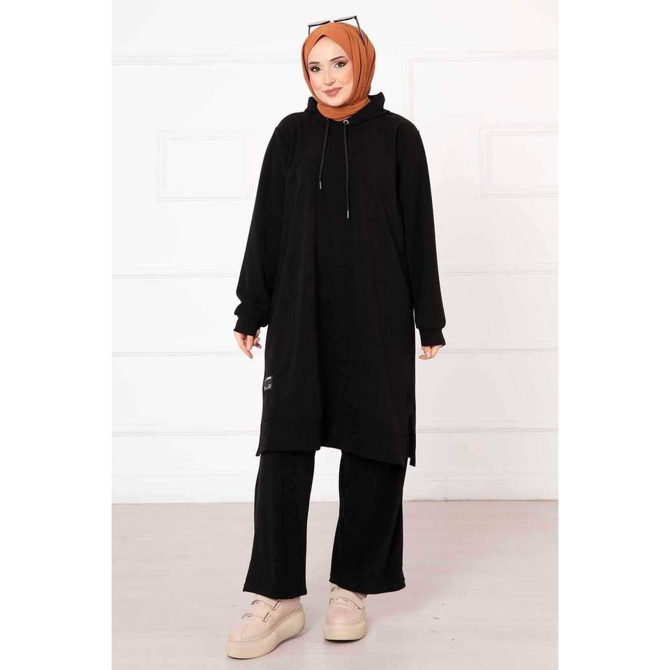 ชุดกางเกงขาสั้นปักลายมีฮู้ดสำหรับผู้หญิง2ชิ้นเสื้อสีดำขนาด XS ทรงหลวมยาวเท่าเข่า