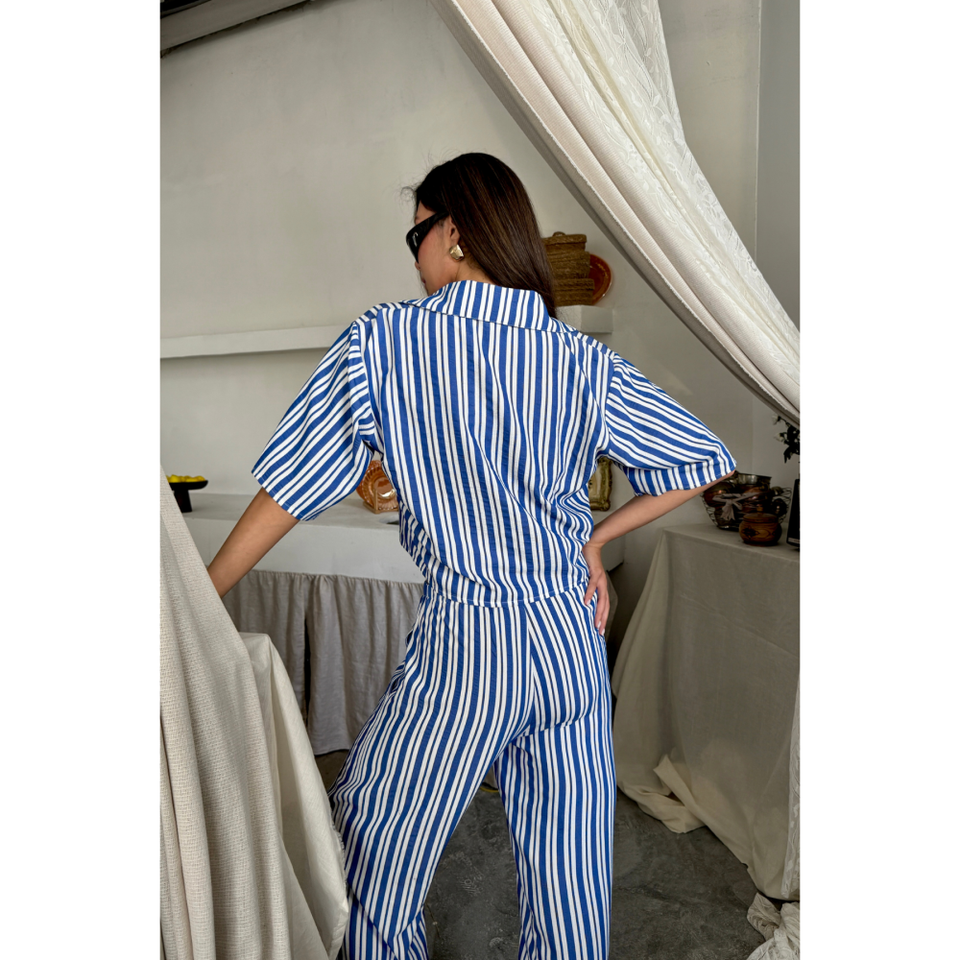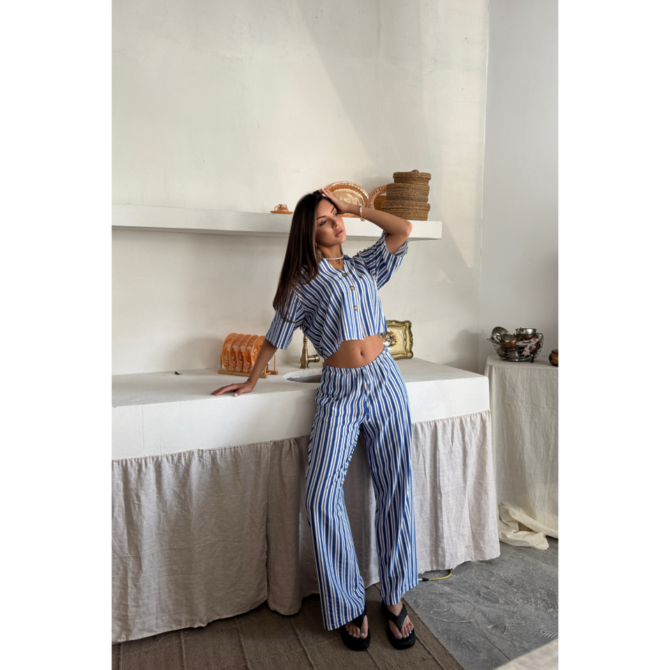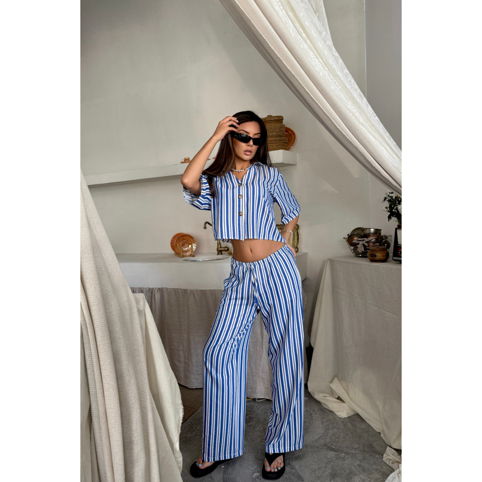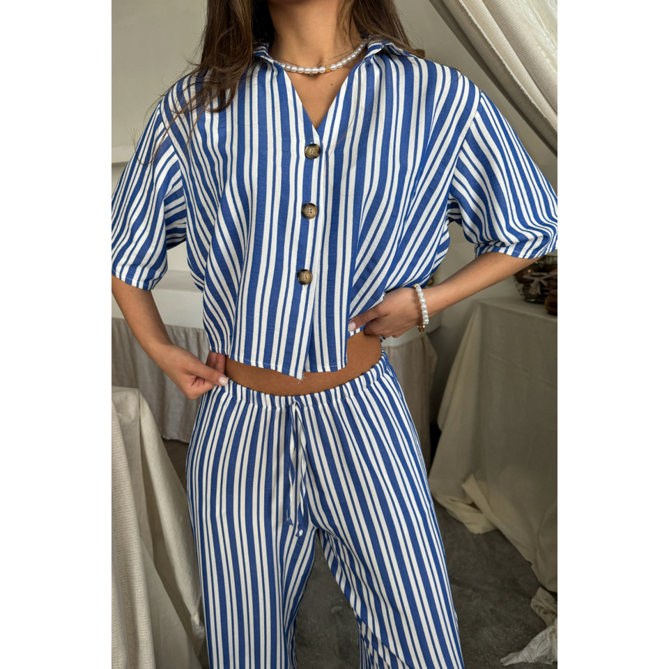 Lady's Blue Modal 2-Piece Shorts Set Striped Crop Top and Loose-Fit Above Knee Pant Suit Size XS for Office