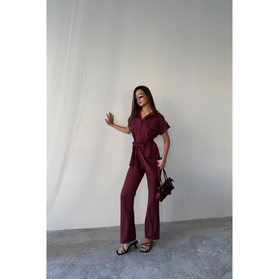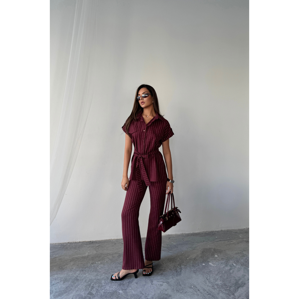 ชุดลำลองแฟชั่นผู้หญิง 2 ชิ้น เสื้อและกางเกงขายาวลายทางสีแดงเบอร์กันดี ผ้าโพลีวิสโคส ทรงหลวม ใส่ได้ทั้งฤดูใบไม้ร่วงและฤดูหนาว