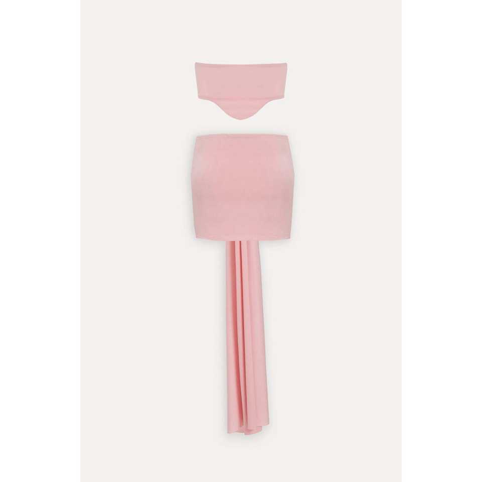 ชุดลำลองสองชิ้นสำหรับผู้หญิง สีชมพูพาสเทล เสื้อถักและกระโปรงยาวเหนือเข่า ไซส์ XS สำหรับฤดูร้อนและฤดูหนาว