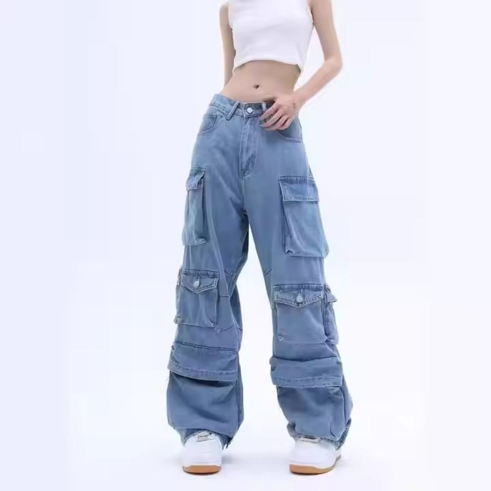 กางเกงยีนส์ทรงขาบานแบบลำลองสำหรับผู้หญิง เนื้อผ้าระบายอากาศ เป็นมิตรต่อสิ่งแวดล้อม ผลิตจากผ้ายีนส์ผสมสแปนเด็กซ์/คอตตอน ทรงคาร์โก้ ลุคทำสีซีด เอวสูง ทรงขาบาน