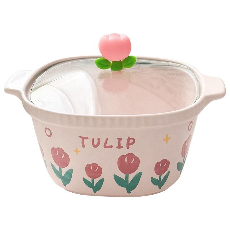 ชุดชามก๋วยเตี๋ยวลายดอกทิวลิปชามเซรามิกพร้อมฝาแก้วพิมพ์โลโก้ Laimi