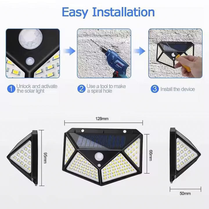 โคมไฟสวนคุณภาพสูงราคาถูก โคมไฟพลังงานแสงอาทิตย์สำหรับภายนอกอาคาร 100 LED กันน้ำ พร้อมเซ็นเซอร์ตรวจจับความเคลื่อนไหว ไฟติดผนังสวนพลังงานแสงอาทิตย์