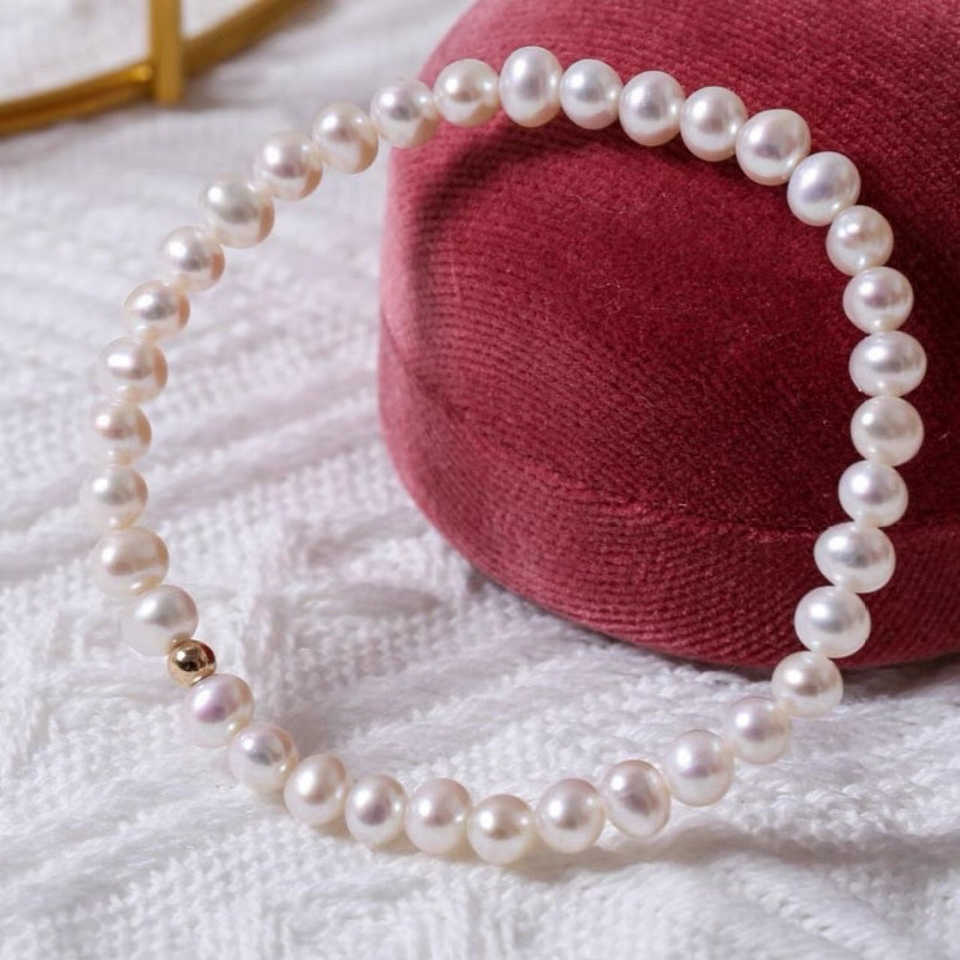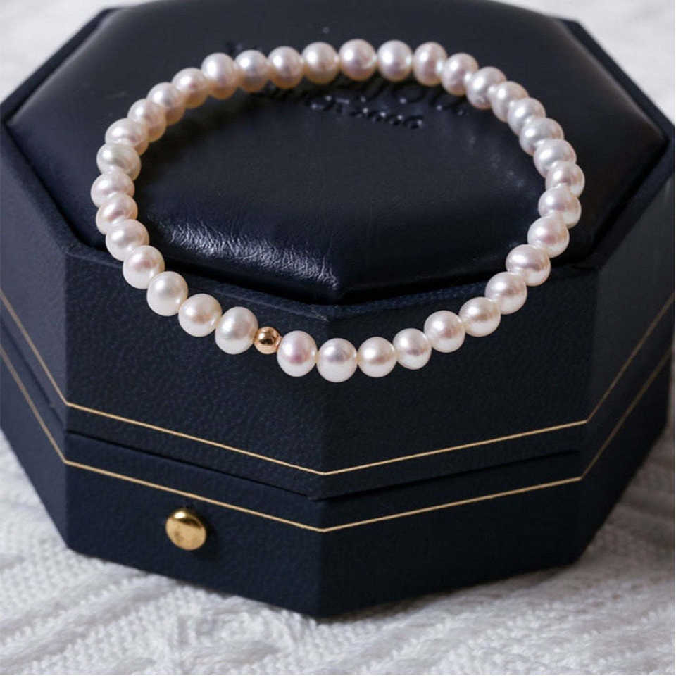 สร้อยข้อมือไข่มุกน้ำจืดทรงเกือบกลม ขนาด 5-6 มม. ยี่ห้อหลานหยุน ชุบเงินแท้ 925 ชุบทอง 18K สายยางยืด ยาว 17 ซม.