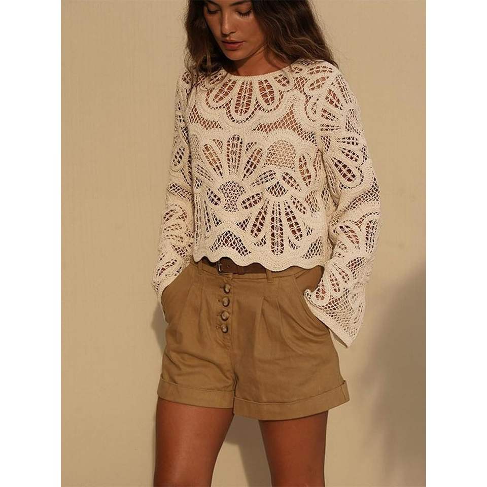 เสื้อโครเชต์แขนกระดิ่งสำหรับผู้หญิง ผ้าถักบางโปร่ง ระบายอากาศได้ดี ซีทรู เหมาะสำหรับชุดเที่ยวพักผ่อนช่วงฤดูร้อน