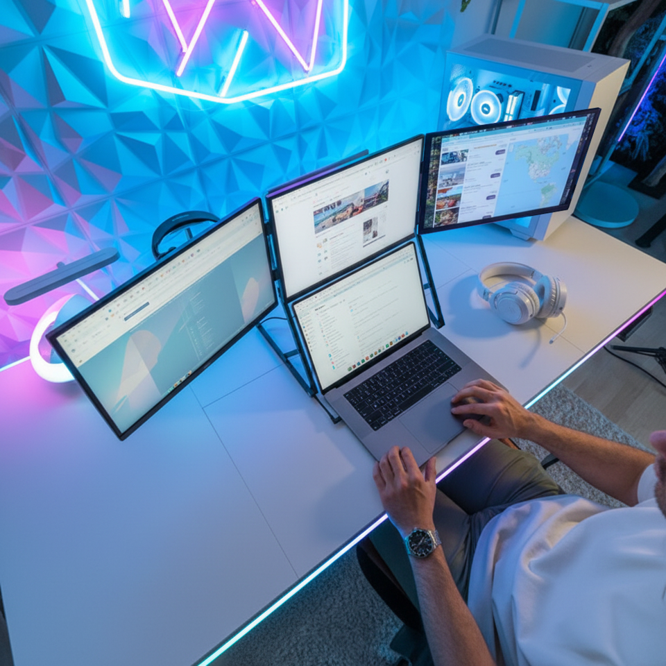 จอขยายสำหรับแล็ปท็อปแบบสามจอ เชื่อมต่อสายเคเบิลเส้นเดียว ความละเอียด 1080P FHD IPS จอพกพาแบบสามจอพร้อมลำโพง จอภาพสำหรับเดินทางแบบบางเฉียบ
