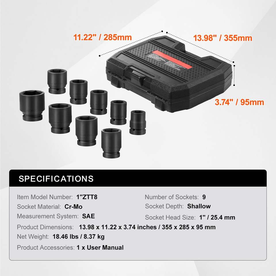 ชุดซ็อกเก็ตขันน็อตล้อแบบ 6 จุด ขนาด 1 นิ้ว สำหรับงานหนัก 9 ชิ้น พร้อมซ็อกเก็ตขันน็อตล้อแบบกระแทก วัสดุ CR-MO ผ่านการอบชุบแข็ง พร้อมกล่องเก็บ