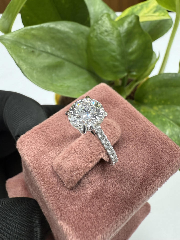 แหวนเพชรทรงกลมขนาดใหญ่ 5 กะรัต เพชรสร้างในห้องปฏิบัติการ ดีไซน์เรียบหรู ตัวเรือนทองคำขาว 18K ประดับเพชรเม็ดเดี่ยว 6 กรงเล็บ สำหรับผู้หญิง