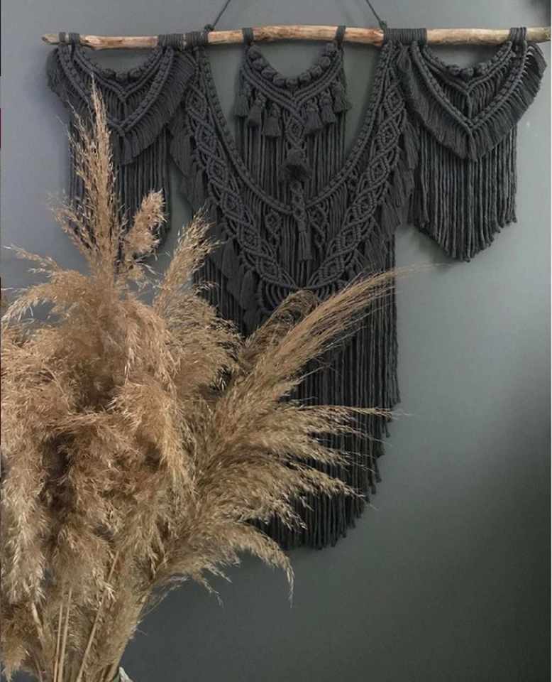 ฉากหลังแมคคราเมดสีดำขนาดใหญ่ที่แขวนติดผนังศิลปะสมัยใหม่ของขวัญที่ไม่เหมือนใครสำหรับการตกแต่งผนังที่มีสไตล์ในอุดมคติราคาไม่แพง