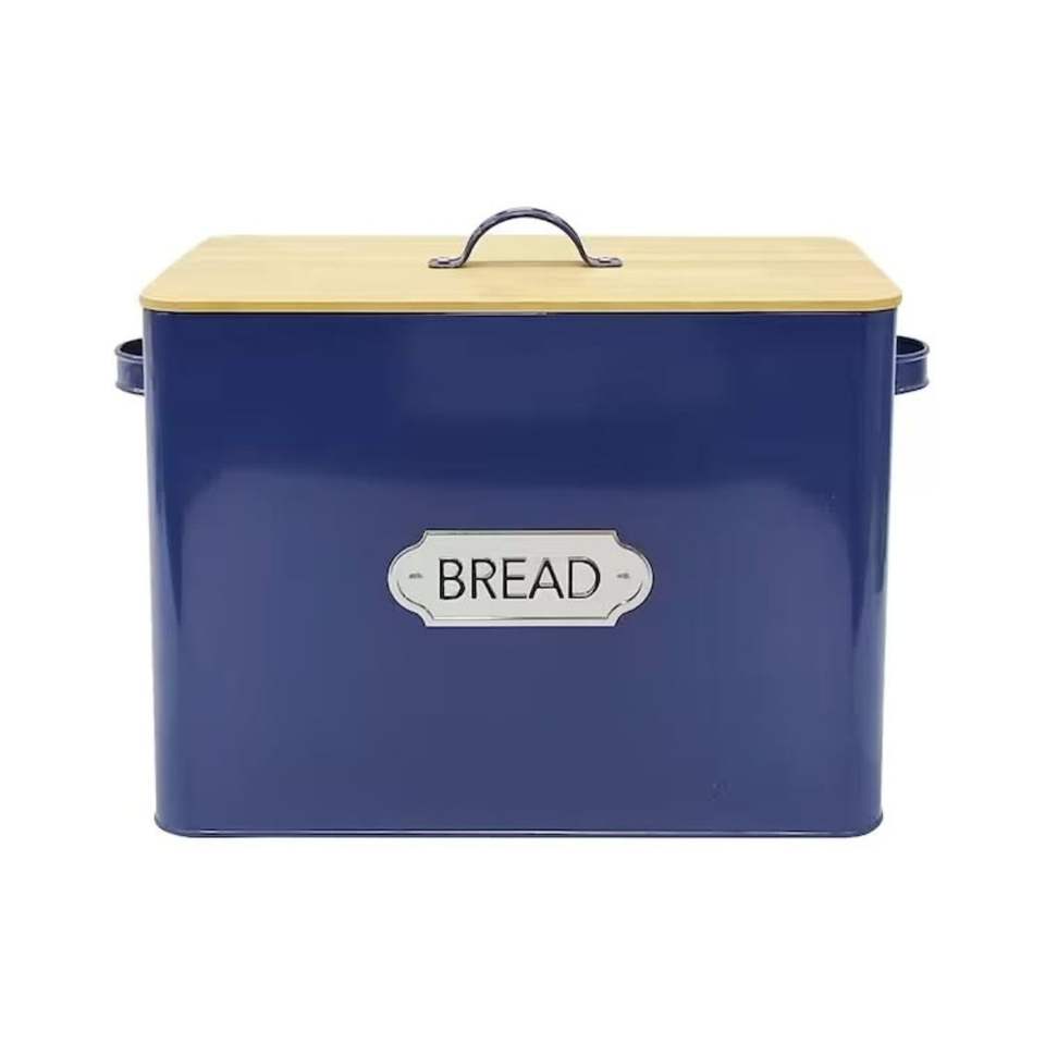 Large Blue Metal Bread Box with Bamboo Lid Airtight Food Storage Container Kitchen Countertop Bread Bin Loaf Holder Organizer