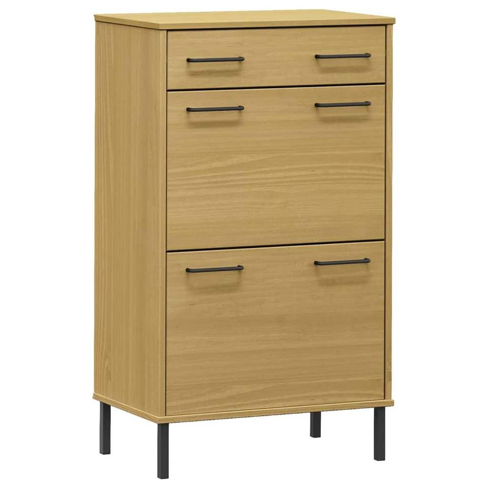 ชั้นวางรองเท้าไม้สนสีน้ำตาลขนาดใหญ่และโครงโลหะ