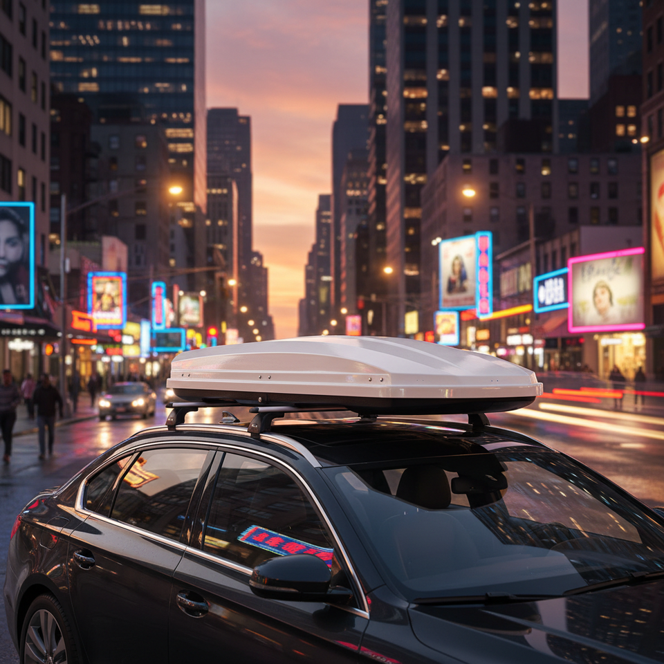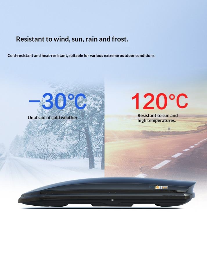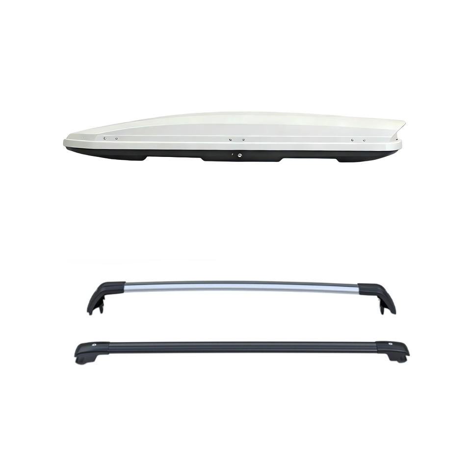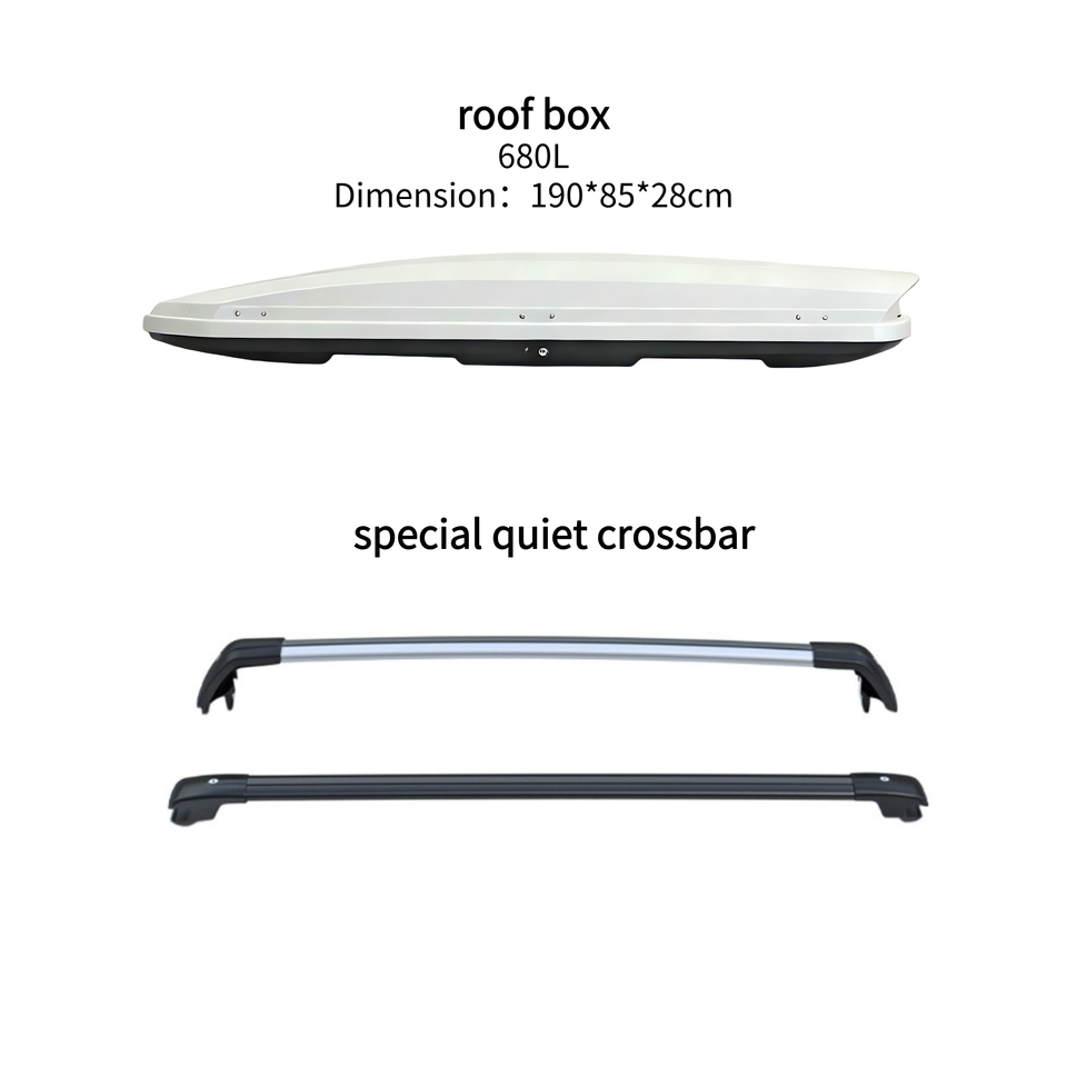 กล่องเก็บสัมภาระบนหลังคาแบบสปอร์ตสีขาว ความจุขนาดใหญ่ 680 ลิตร ผลิตจากวัสดุ ABS+ASA+PC พร้อมแถบกันน้ำแบบแอโรไดนามิก โครงสร้างอะลูมิเนียมอัลลอย เปิดได้สองด้าน