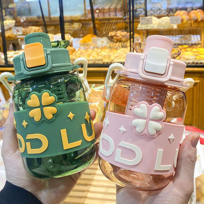 ขวดน้ำพลาสติกสำหรับเด็กความจุขนาดใหญ่900มล. พร้อมสายรัดแบบพกพาหลอดดูดดีไซน์รูปหัวใจ