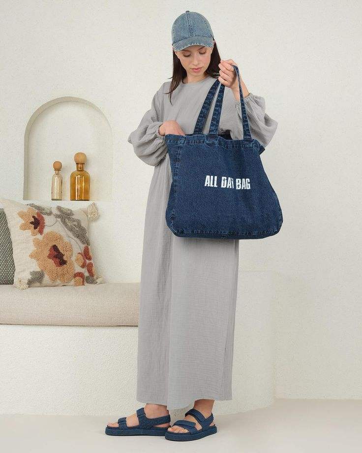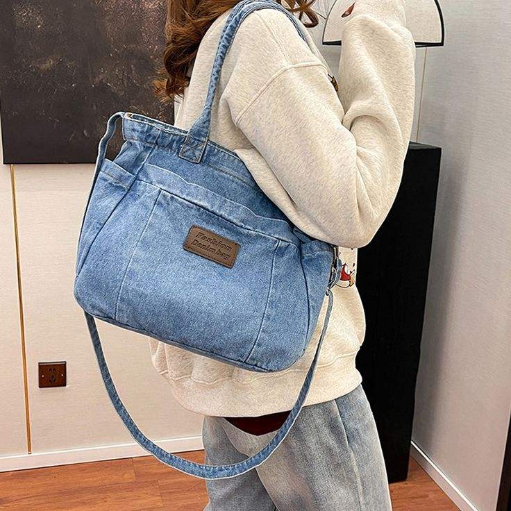กระเป๋าผ้าเดนิมขนาดใหญ่ ใส่ของได้เยอะ มีช่องด้านหน้า กระเป๋าถือสะพายไหล่ผ้าแคนวาสสีน้ำเงิน สำหรับใช้ช้อปปิ้งประจำวัน ไปเที่ยวทะเล