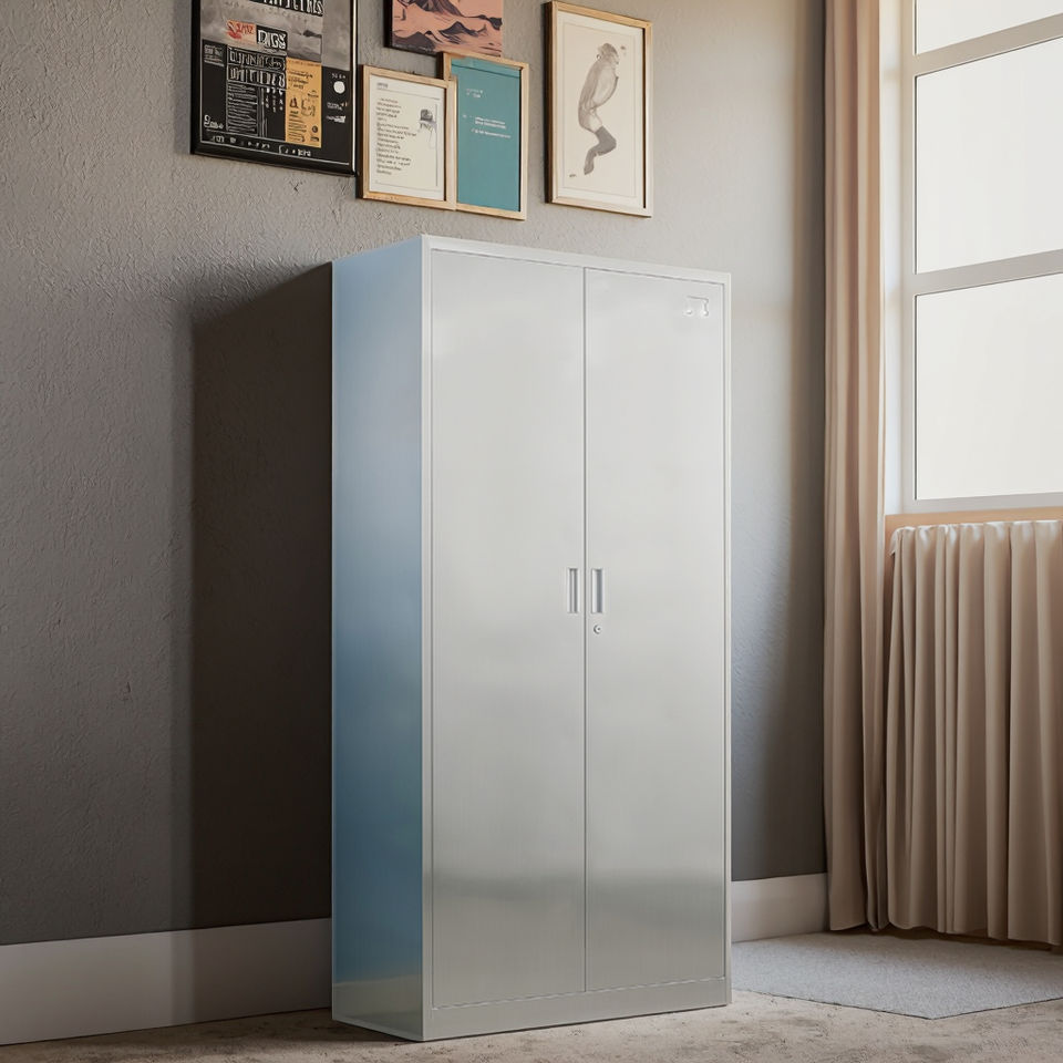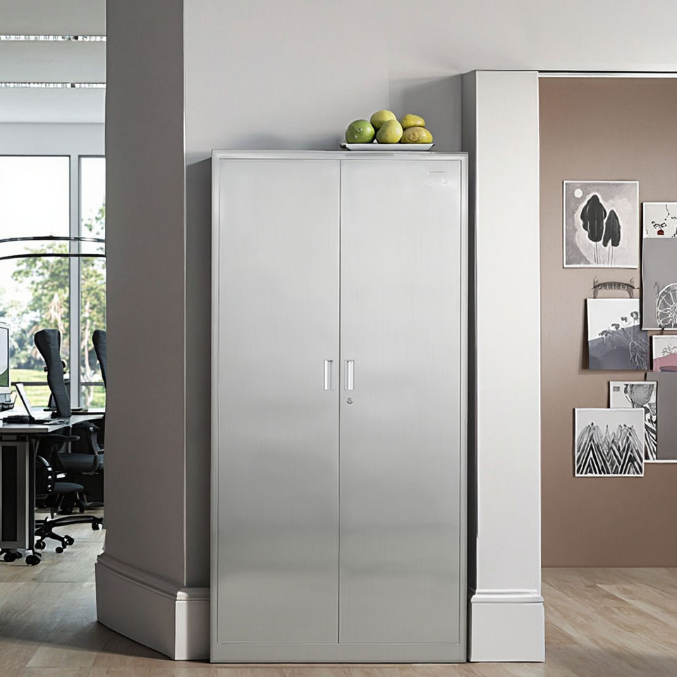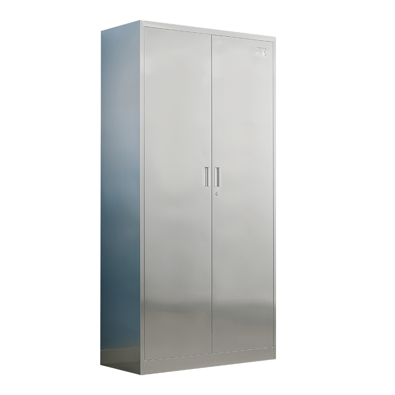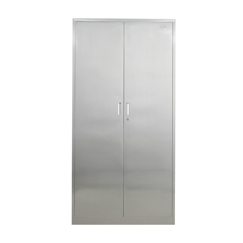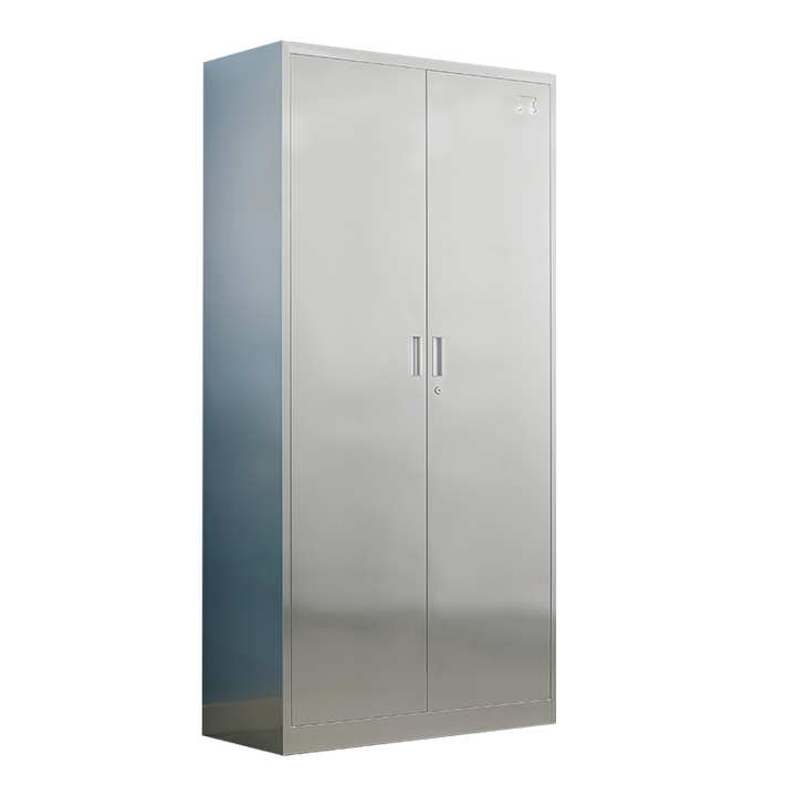ตู้สแตนเลสสองประตูขนาดใหญ่ พร้อมช่องเก็บของด้านบนและด้านล่าง สำหรับสำนักงาน บ้าน และห้องครัว