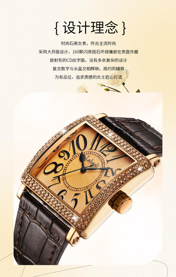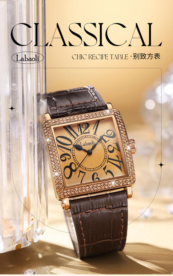 หน้าปัดขนาดใหญ่สไตล์เรโทรแฟชั่นประดับเพชรสายหนังนาฬิกาควอทซ์กันน้ำ