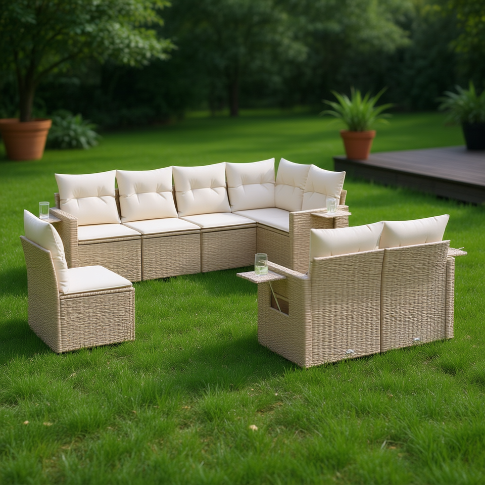 ชุดโซฟาสวนกลางแจ้งสีเบจ วัสดุหวาย PE พับได้ ดีไซน์ร่วมสมัย สำหรับเฟอร์นิเจอร์ระเบียง