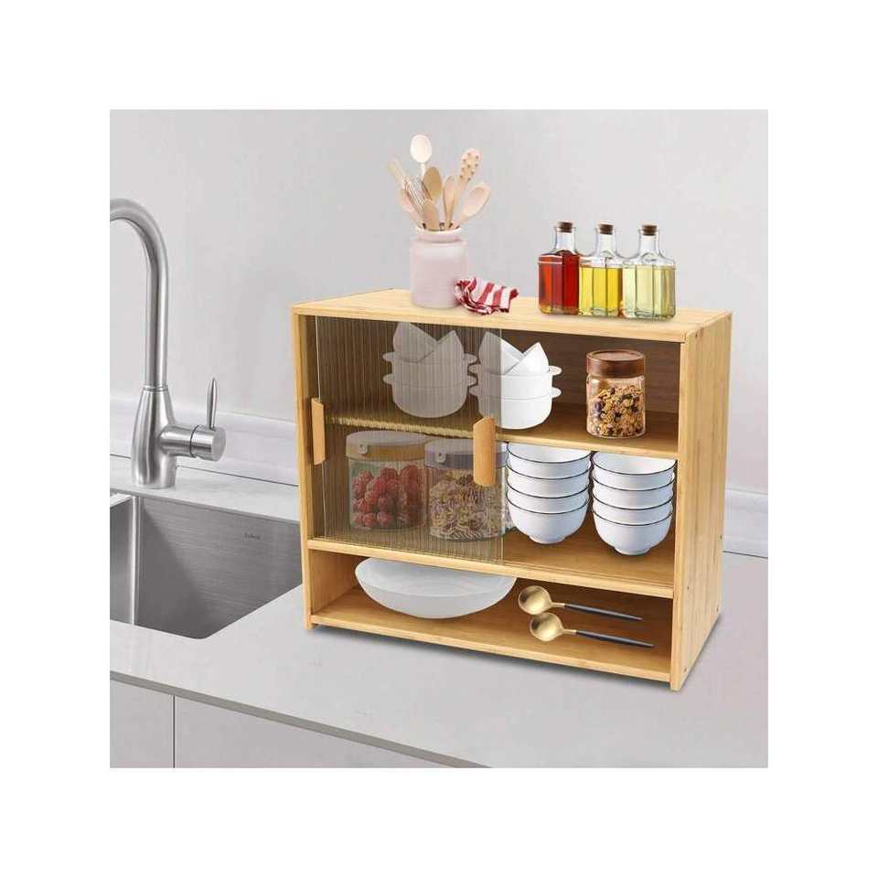Large Freestanding Countertop Storage Cabinet Spice 2 Sliding Striped Glass Doors Bamboo Kitchen Pantry Sideboard Good