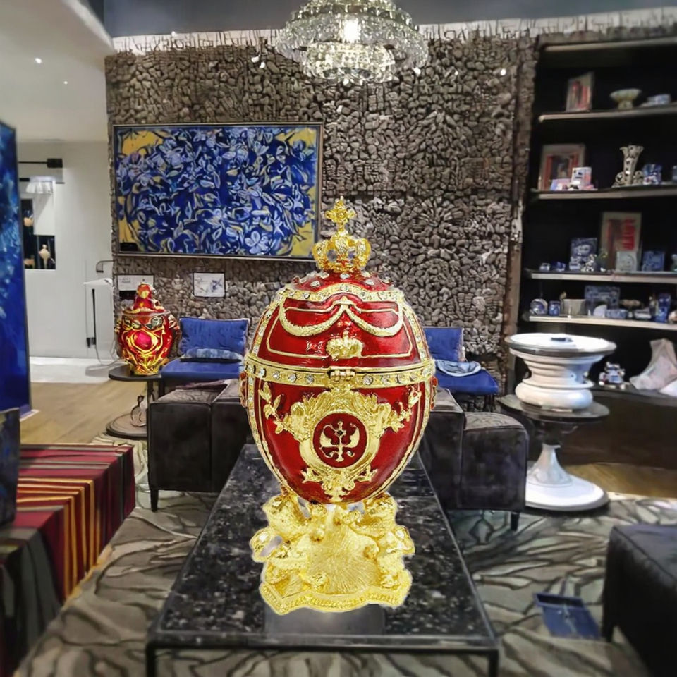 กล่องเครื่องประดับรูปไข่ฟาแบร์เช่รัสเซียโบราณสีแดงทองเหลืองขนาดใหญ่ ตกแต่งมงกุฎ ประดับด้วยสีสัน ใช้ตกแต่งบ้าน เหมาะสำหรับเทศกาลอีสเตอร์