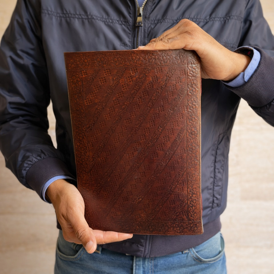 สมุดบันทึกหนังแท้ทำมือขนาดใหญ่ ลายเงาหนังสือโบราณ สไตล์เรียบง่ายสำหรับงานแต่งงาน สมุดเย็บกระดาษขอบหยัก ของขวัญ