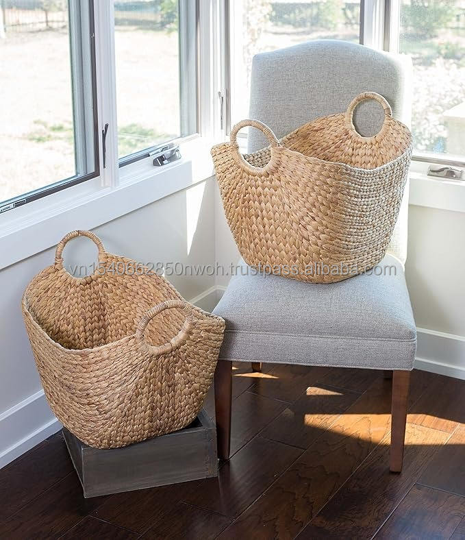 ตะกร้าใส่ของผักตบชวาธรรมชาติทำด้วยมือขนาดใหญ่พร้อมตะกร้าหวายหญ้าทะเลสำหรับใส่เสื้อผ้าในบ้านทุกวัน