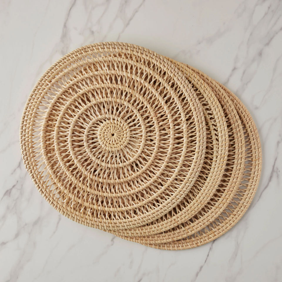 แผ่นรองจานหวายทรงกลมขนาดใหญ่แผ่นรองจานหวายสานเป็นมิตรต่อสิ่งแวดล้อมสำหรับงานเลี้ยงร้านอาหารและของตกแต่งบ้านขายส่ง