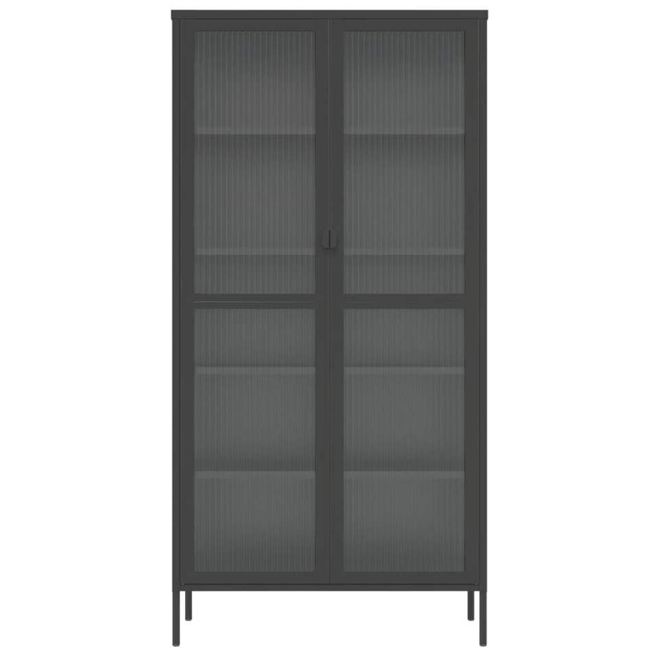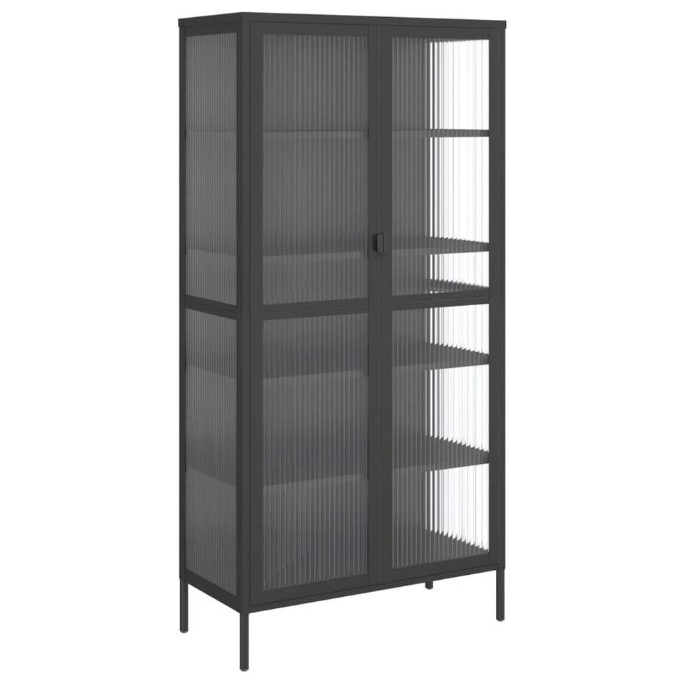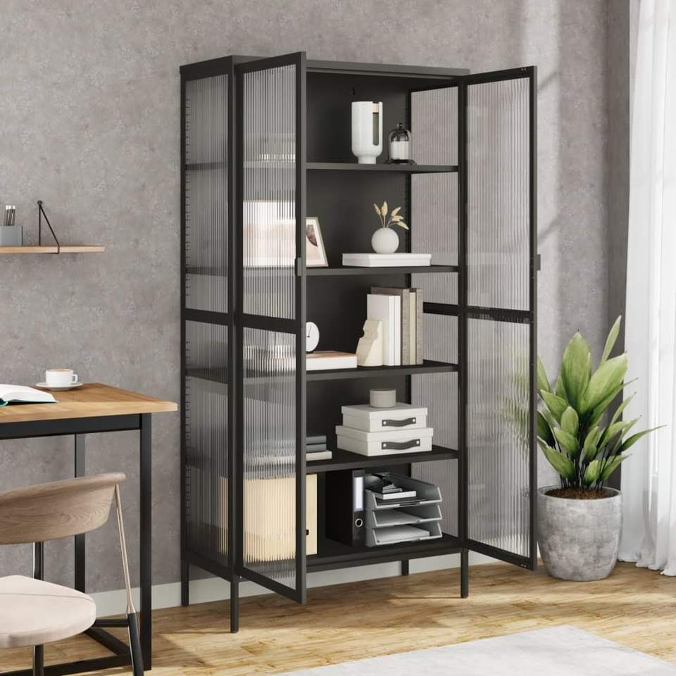 ตู้ไฮบอร์ดขนาดใหญ่ทำจากเหล็กเคลือบสีดำพร้อมกระจกแบบริบบิ้น ตู้เก็บของห้องนั่งเล่นดีไซน์หรูหรา