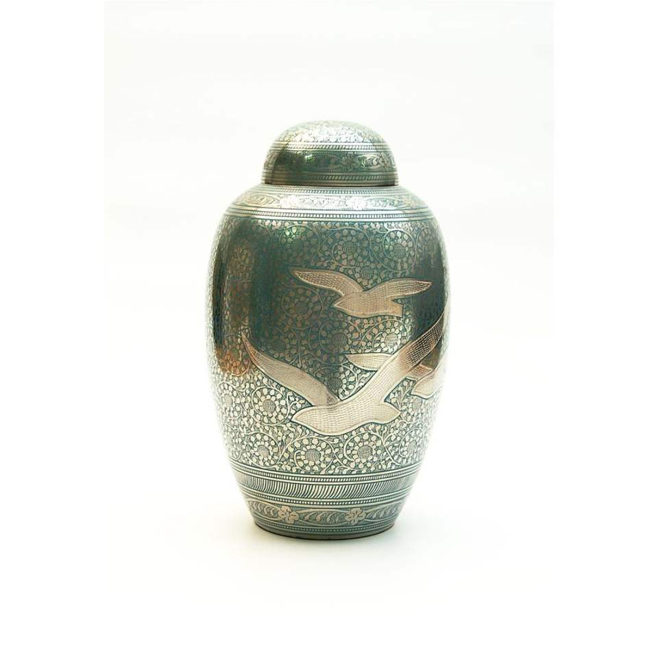 โกศโลหะขนาดใหญ่สำหรับใส่เถ้ากระดูกของมนุษย์ทำด้วยมือทำจากทองเหลืองโกศตกแต่งด้วยการบินดีไซน์รูปนก