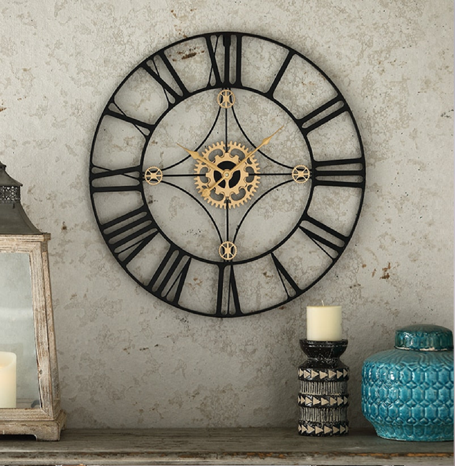 นาฬิกาแขวนผนังขนาดใหญ่ที่ทันสมัยพร้อมกรอบโลหะสีดำและการออกแบบที่เรียบง่ายหน้าเปิด