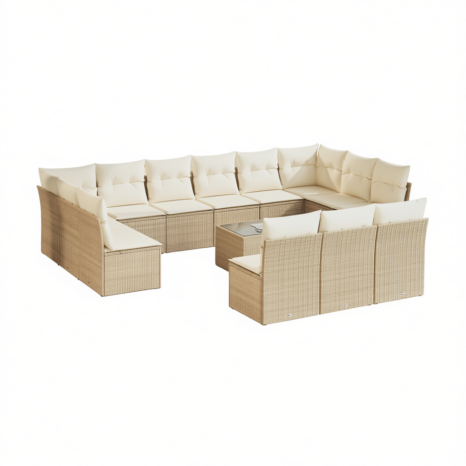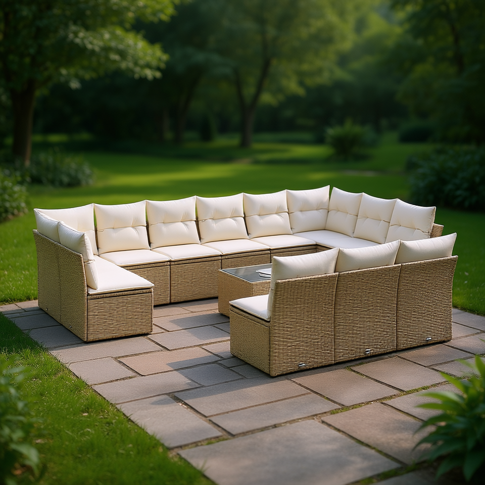 ชุดโซฟาหวายสีเบจสำหรับสวน เฟอร์นิเจอร์กลางแจ้งแบบโมดูลาร์ ดีไซน์ร่วมสมัย นั่งสบาย พร้อมเบาะโฟมความหนาแน่นสูง