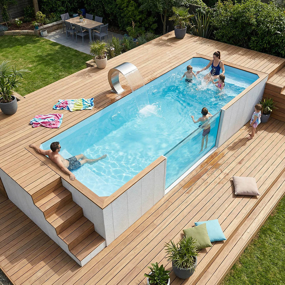 สระว่ายน้ำขนาดใหญ่แบบโมดูลาร์จากตู้คอนเทนเนอร์ วัสดุไฟเบอร์กลาส ตั้งบนพื้นดิน พร้อมอุปกรณ์ครบชุด สำหรับวิลล่า รีสอร์ท โรงแรม