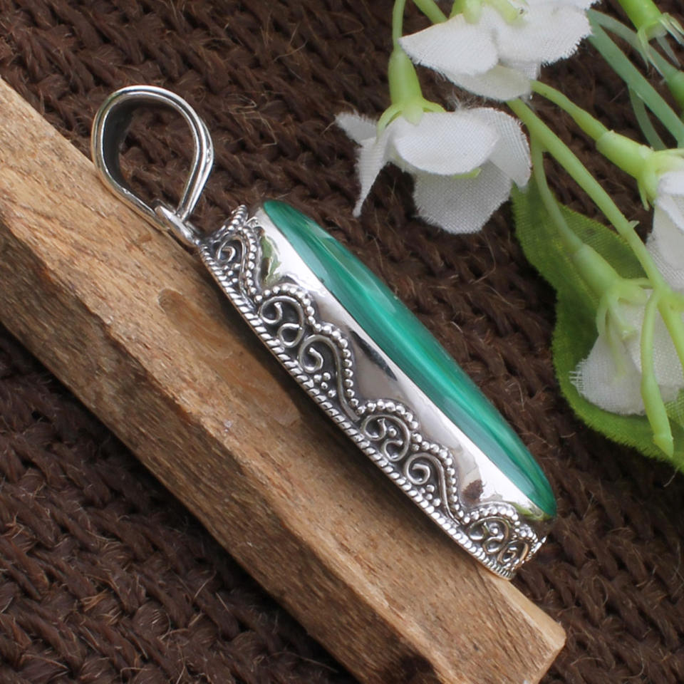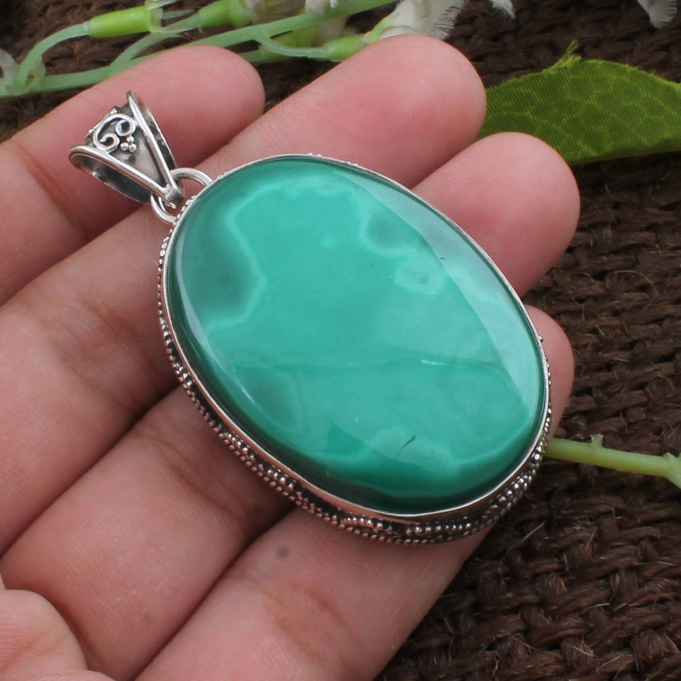 จี้มาลาไคต์ธรรมชาติขนาดใหญ่ เงินแท้ 925 ชุบแพลตตินั่ม สไตล์วินเทจ ตัวเรือนแบบฝังขอบ สร้อยคอแบบโดดเด่น งานแฮนด์เมด