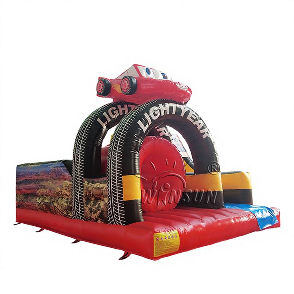 รถบรรทุกเป่าลมขนาดใหญ่สำหรับเด็กเล่นกลางแจ้ง พร้อมแทรมโพลีน ทำจาก PVC ปรับแต่งสีและโลโก้ได้ ทนไฟ ติดตั้งง่าย