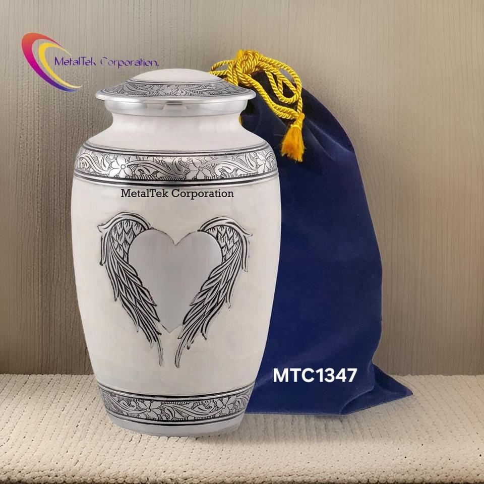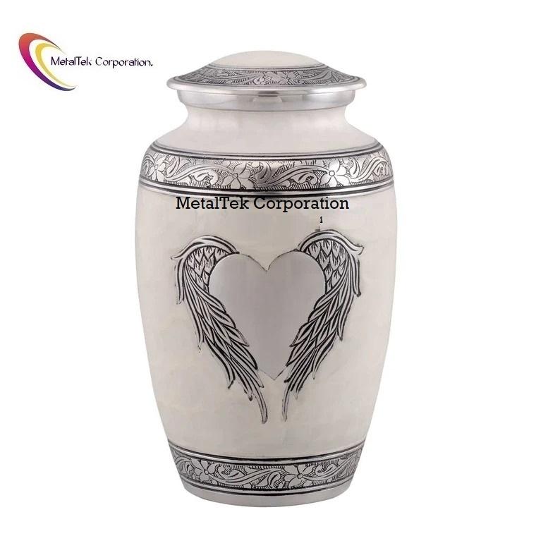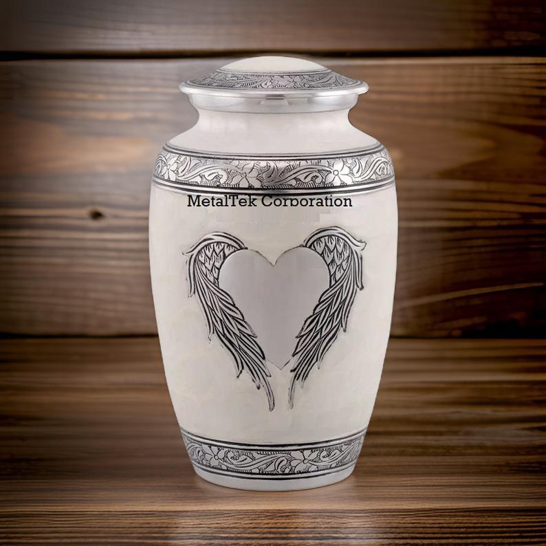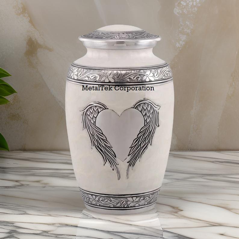 โกศบรรจุอัฐิสีขาวมุกขนาดใหญ่รูปปีกนางฟ้าสำหรับผู้ใหญ่ชายหญิง พร้อมตกแต่งรูปหัวใจสีเงิน สำหรับงานศพ