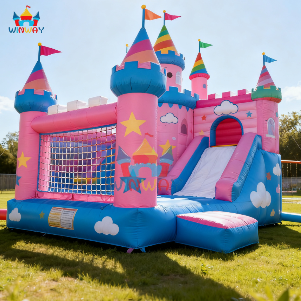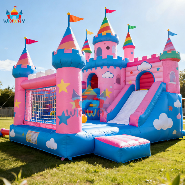 บ้านเป่าลมเป่าลมสีชมพูขนาดใหญ่พร้อมสไลด์สำหรับเด็กบ้านเป่าลมเกรดเชิงพาณิชย์พร้อมตาข่ายสำหรับงานหนัก