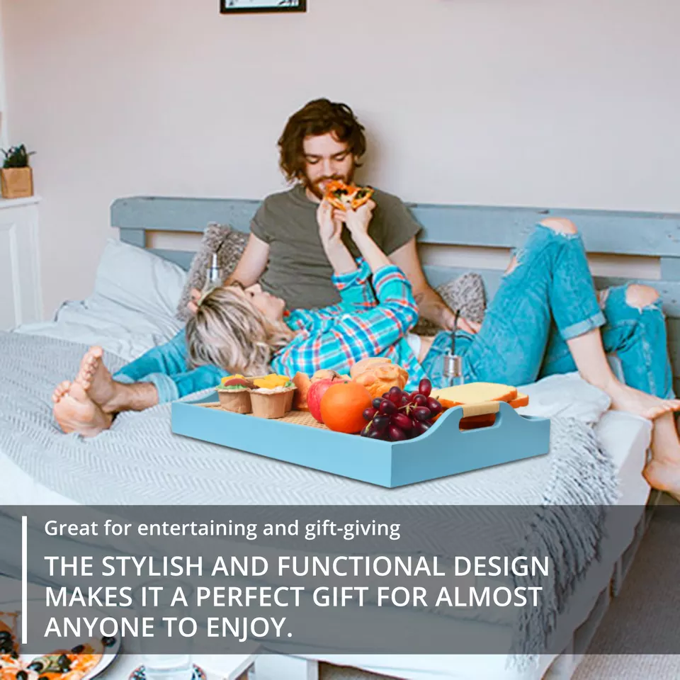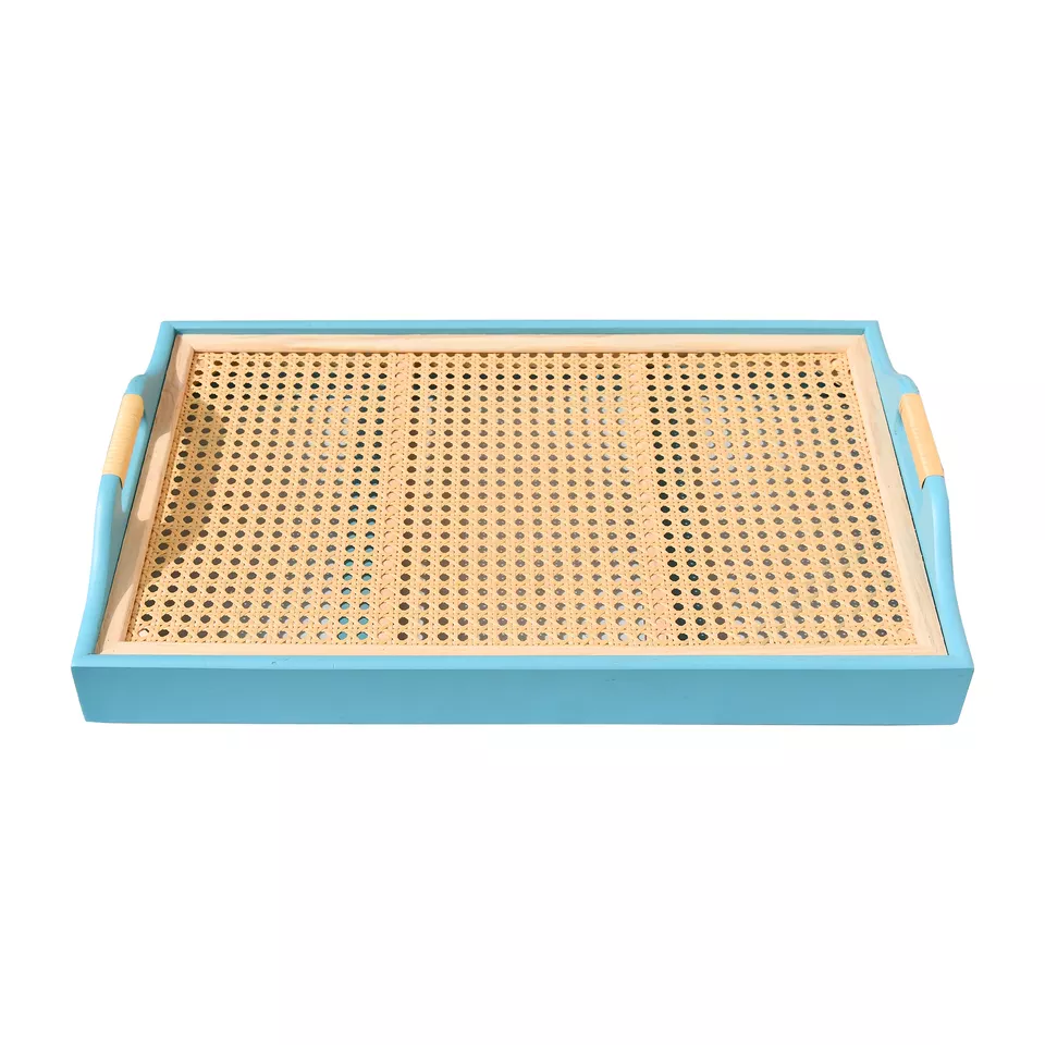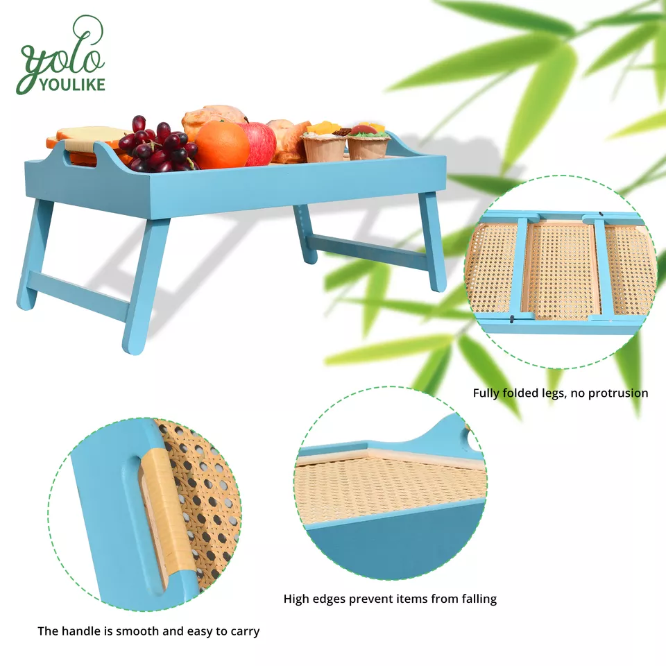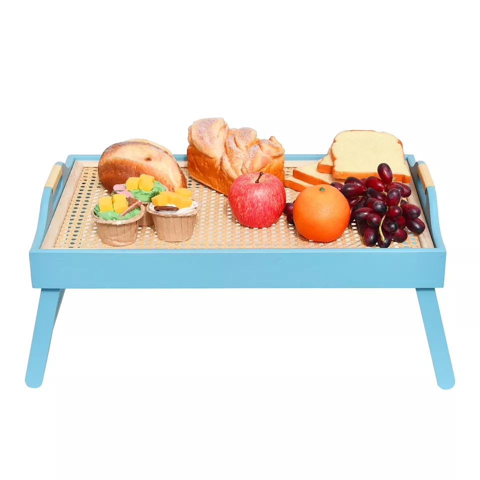 ถาดไม้ไผ่สี่เหลี่ยมขนาดใหญ่พร้อมหวายเทียมและขาพับได้โครงไม้ไผ่สีฟ้า
