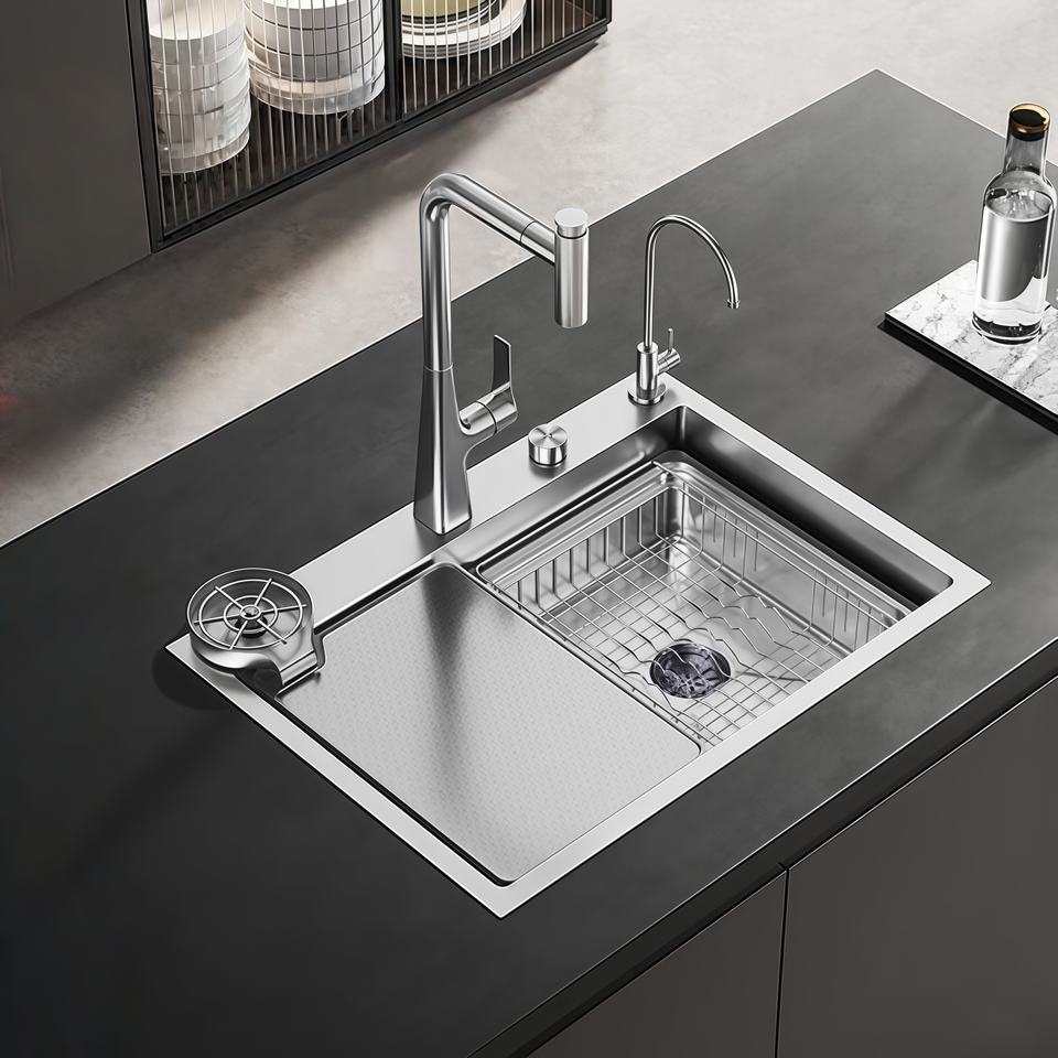 อ่างล้างจานเดี่ยวขนาดใหญ่ สแตนเลส 304 สำหรับครัวเรือน พร้อมตะกร้ากรองเศษอาหาร สีเดิม