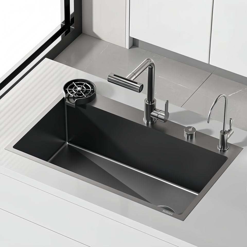 อ่างล้างจานเดี่ยวขนาดใหญ่ สเตนเลส 304 พร้อมก๊อกน้ำแบบเรนชาวเวอร์/วอเตอร์ฟอล อ่างล้างผักในตัว ปรับแต่งได้