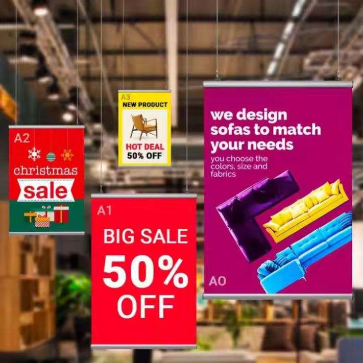 ป้ายแบนเนอร์พับเก็บได้ขนาดใหญ่แบบกำหนดเองสำหรับติดตั้งบนเพดาน พิมพ์งานโฆษณาภายนอกอาคาร ฉากหลังแบนเนอร์ไวนิล PVC